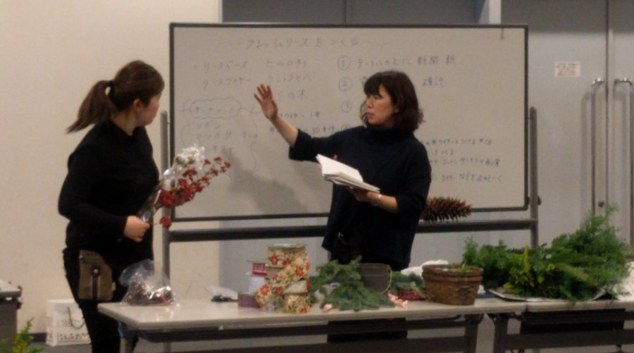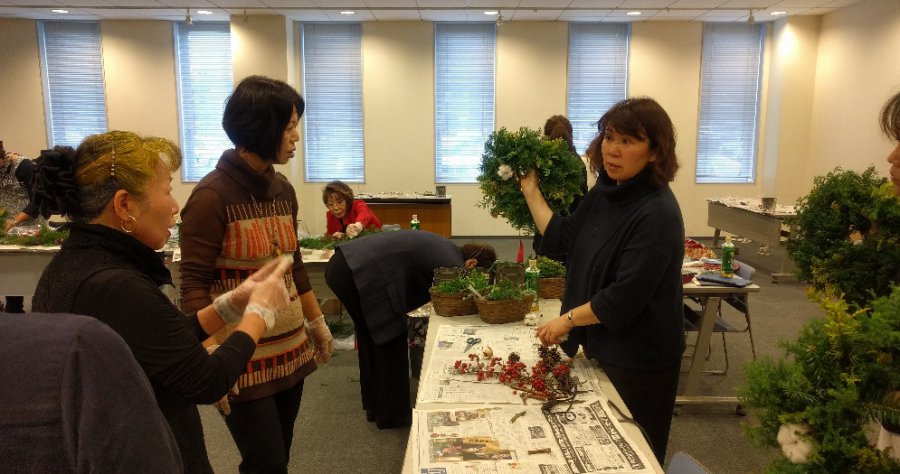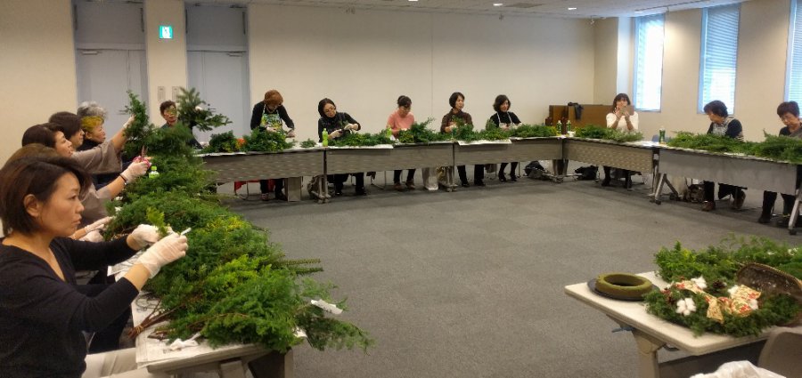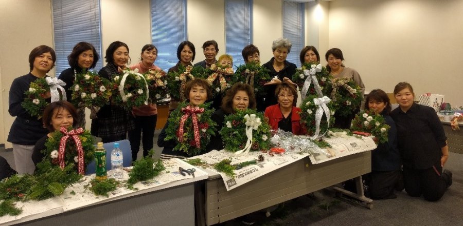 11/28(火)、フラワーショップ旭屋さん(代表取締役:森田俊之氏)による「クリスマスリース手作り講習」が開催され、会員18名が参加しました。