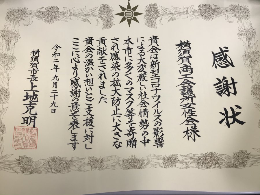 新型コロナウイル感染拡大防止に向け、横須賀商工会議所女性会として、横須賀共済病院、横須賀市立市民病院、横須賀市立うわまち病院の3病院に、マスク1,980枚、医療用ガウン320枚を寄贈致しましたことに対して、横須賀市から感謝状が贈られて参りました。ご担当者の方々からも感謝のお言葉を頂きました。会員の皆様、ご協力ありがとうございました。新型コロナウイルの感染が収束していくことを心より願っております。