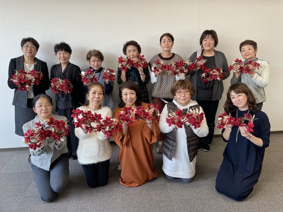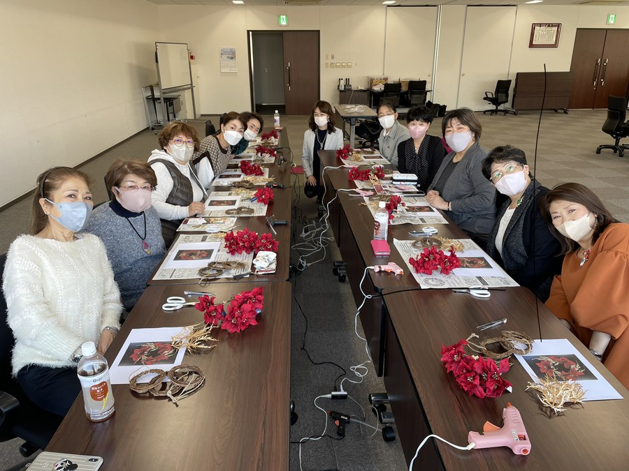 当会会員でもあるプリフラ代表の石川サユミさんに講師をお願いし、会員11名と一般の方1名の計12名にて、グルーガンを使って火傷に気をつけながら、赤いポインセチアとゴールドの葉を形よくリース型の台輪につけていきます。クリスマスシーズンを彩る、とても可愛いアレンジ花が出来上がりました。