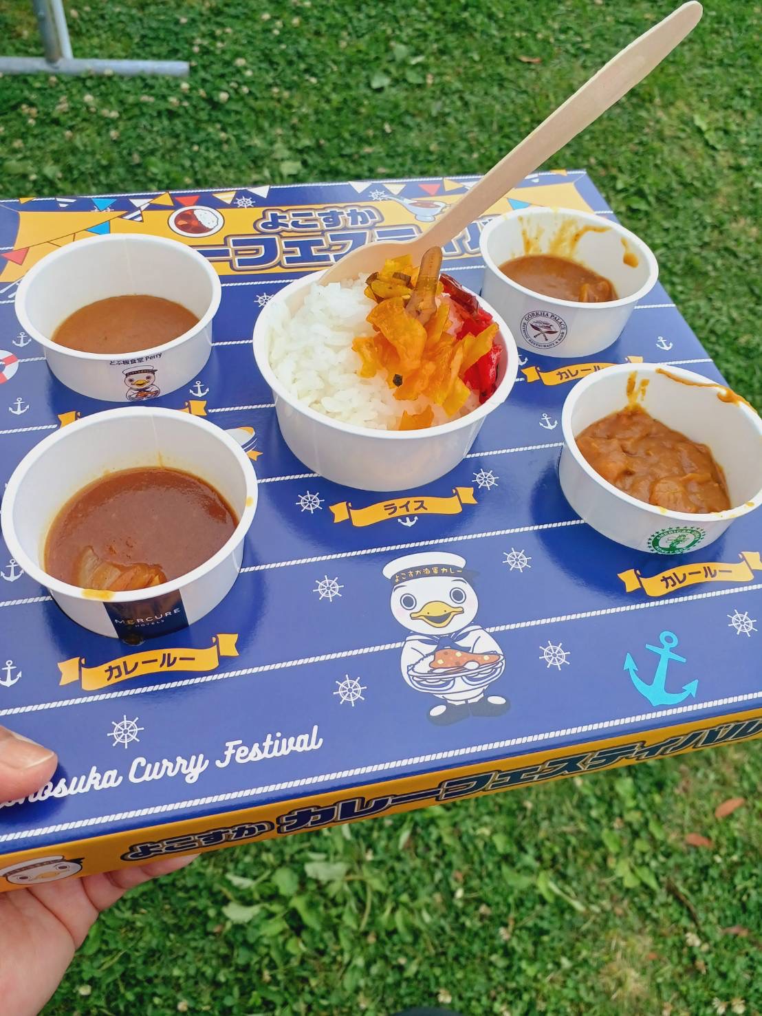 今年は初の試みで、専用トレーにご飯を入れたカップとよこすか海軍カレーと横須賀海自カレーから2種ずつ選んで食べ比べということで、それぞれ好みの4種類のカレーを選んで召し上がっていただきました。