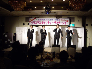 さて、我が女性会会長の挨拶に続き寄付の贈呈式、セントラルホテルが腕に選りを掛け更にはこの大人数に対して、できる限りスムーズに食事を楽しめる様に配慮されたコースメニューを堪能しました。そして、若手実力派ヴォーカルグループ『ジャミン・ゼブ』の登場!ノリの良い曲でスタートしましたが、その後名刺代わりにと日本国歌『君が代』と米国歌『星条旗』を