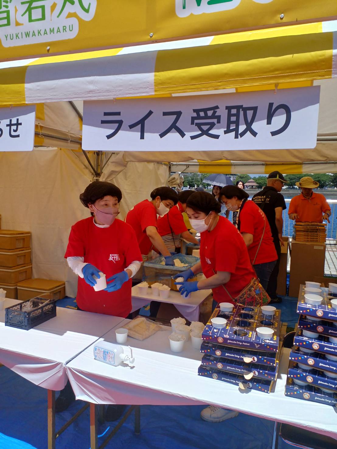 風通しが悪いテントの中でマスクをしながら会計を頑張るスタッフ、トレーを準備するスタッフ、ライスをお渡しするスタッフ・・・それぞれの役割に一生懸命、来場されたみなさんの笑顔を励みに頑張りました!