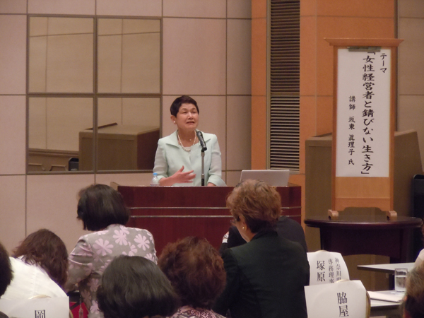 続いて講演会には『女性の品格』の著書で知る人も多い、昭和女子大学 学長 坂東眞理子氏の『女性経営者と錆びない生き方』というテーマでお話しいただきました。現実を変える政策対応という項目で、『40歳新採用、短時間正社員など実質的選択肢の増大』を掲げられました。40歳から定年迄を数えると約20年〜25年は働ける訳で、女性の人生設計に新しい働き方をイメージできるようになるというお話は女性経営者が集うなか、とても意義深く聞かせていただくことが出来ました。
