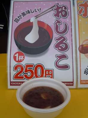 オニオンとピクルスで贅沢に味付けしたボリューム満点のホットドッグは、男性のお客様や子供達に大人気です。餡子にこだわったお餅3個入りのおしるこは、女性や年配の方々に大好評でした。ちょっと肌寒いくらいの時は、フーフー言いながら食べる暖かいものが最高ですね。