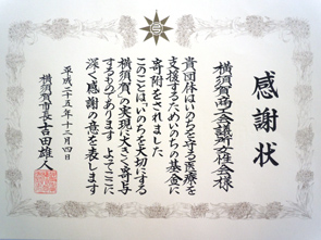 22回目を迎えたチャリティーディナーショーは今年も皆様のお陰で、収益金の一部を寄付させていただくことができましたことを、厚く御礼申し上げます。横須賀市に昨年より創設された『いのちの基金』は市民一人ひとりが命を大切にし、お互いを思いやり、優しさにあふれるまちを目指しています。女性会ではいのちを育み守る医療に役立てていただくために、横須賀市『いのちの基金』に寄付させていただきました。